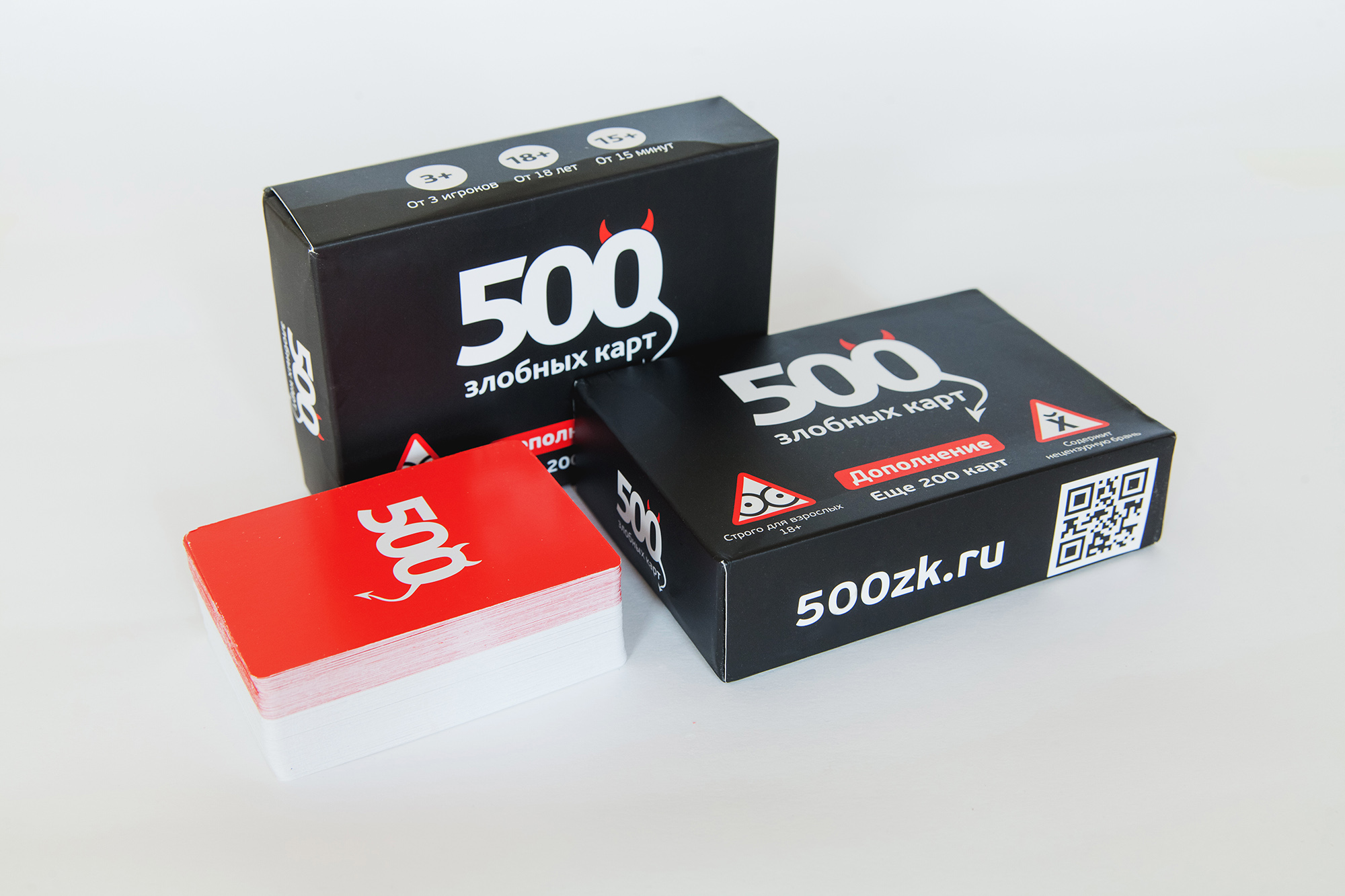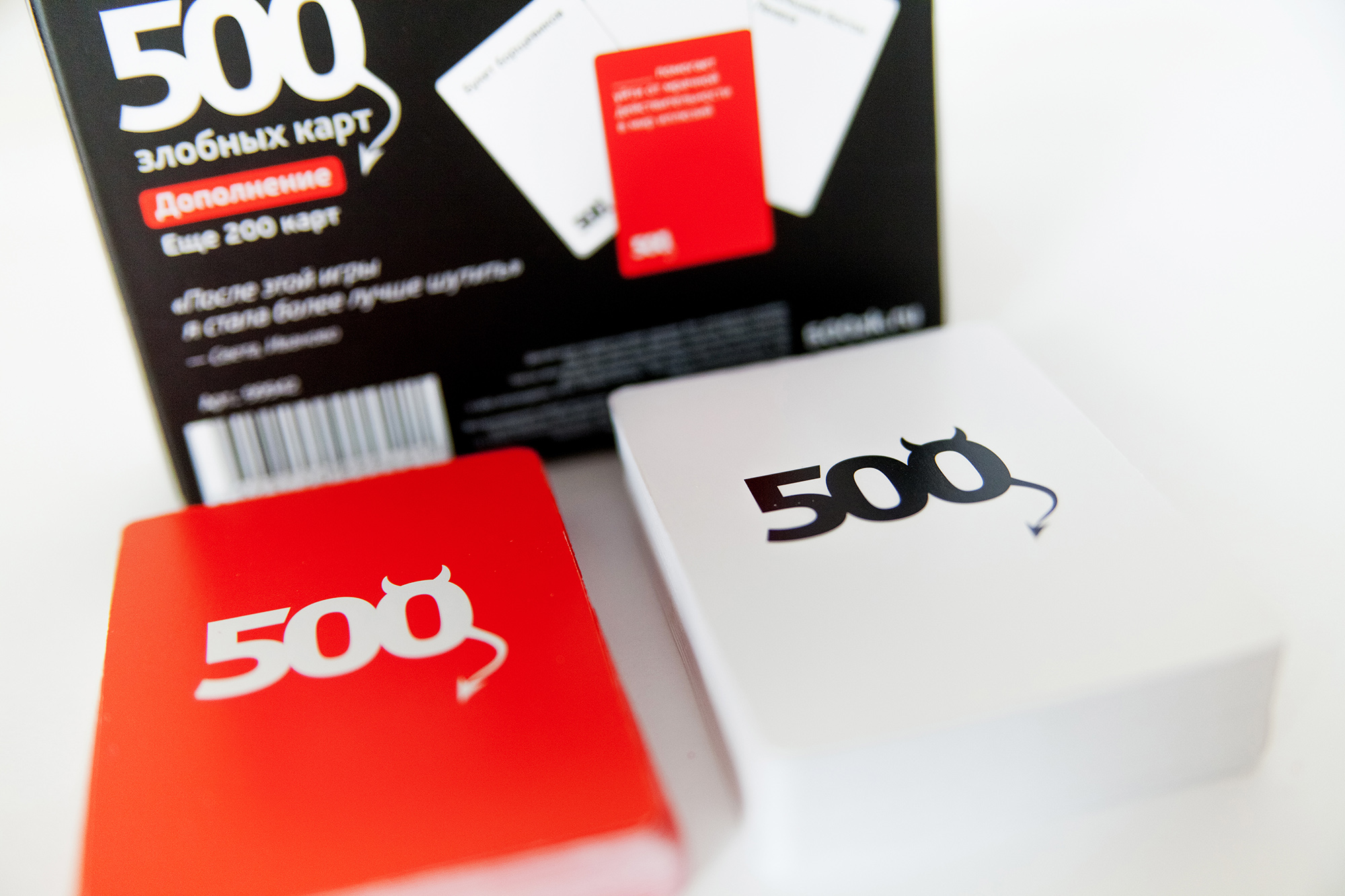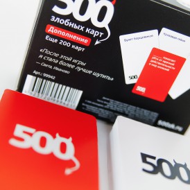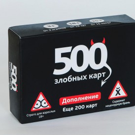 К большой радости любителей игры «500 злобных карт» производитель выпустил «Дополнение». Еще 200 карточек юмористических ответов и абсурдных вопросов. Новые злобные и жестокие фразы порадуют ваших друзей и удивят знакомых. Дополнение так же предназначено только для людей старше 18 лет и желательно обладающих хоть капелькой чувства юмора.