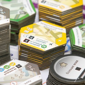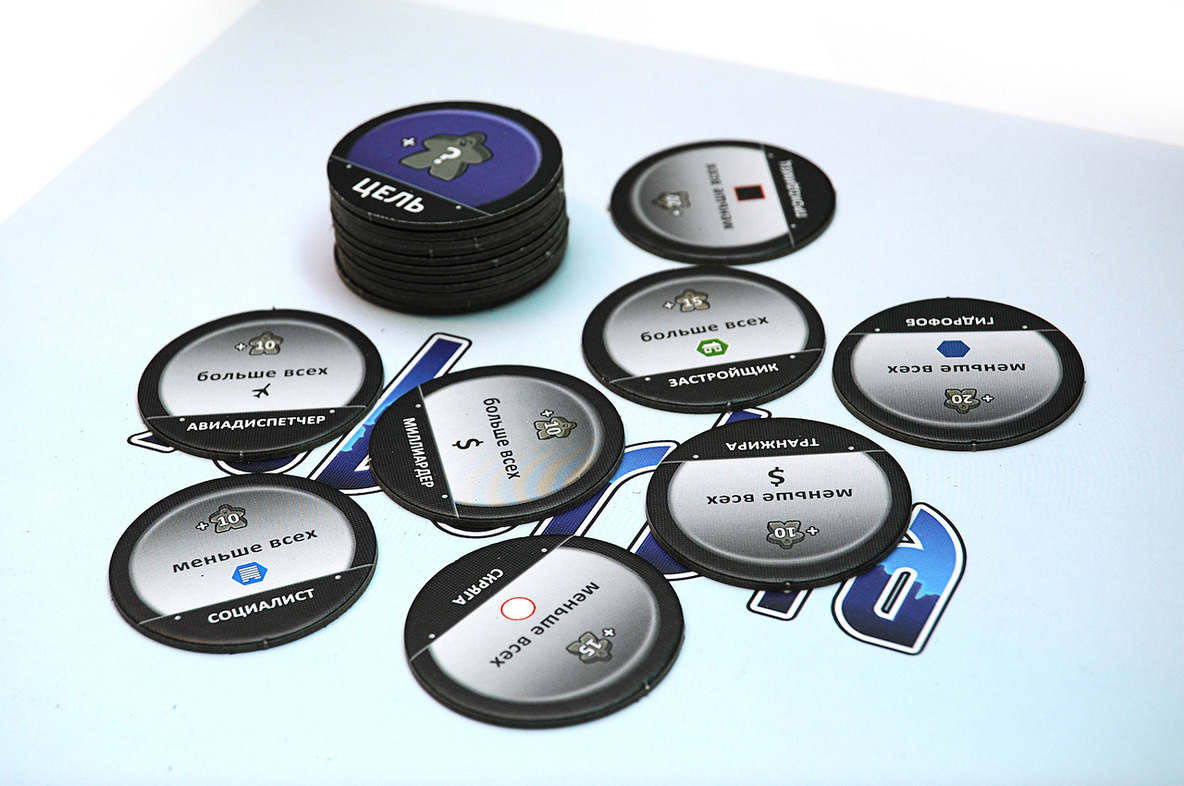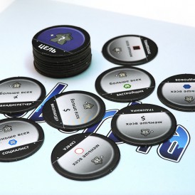 1 новое поле жетонов, 10 жетонов А, 10 жетонов В, 6 жетонов С, 10 жетонов бонусов, 10 жетонов достижений, 12 жетонов границ, 5 жетонов целей, правила (включают перечень жетонов).- 5 жетонов целей.