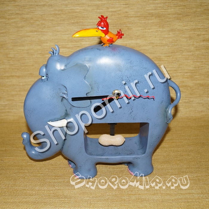 | Настольные часы выполнены в образе слона, маятник выполнен в виде арахиса. |