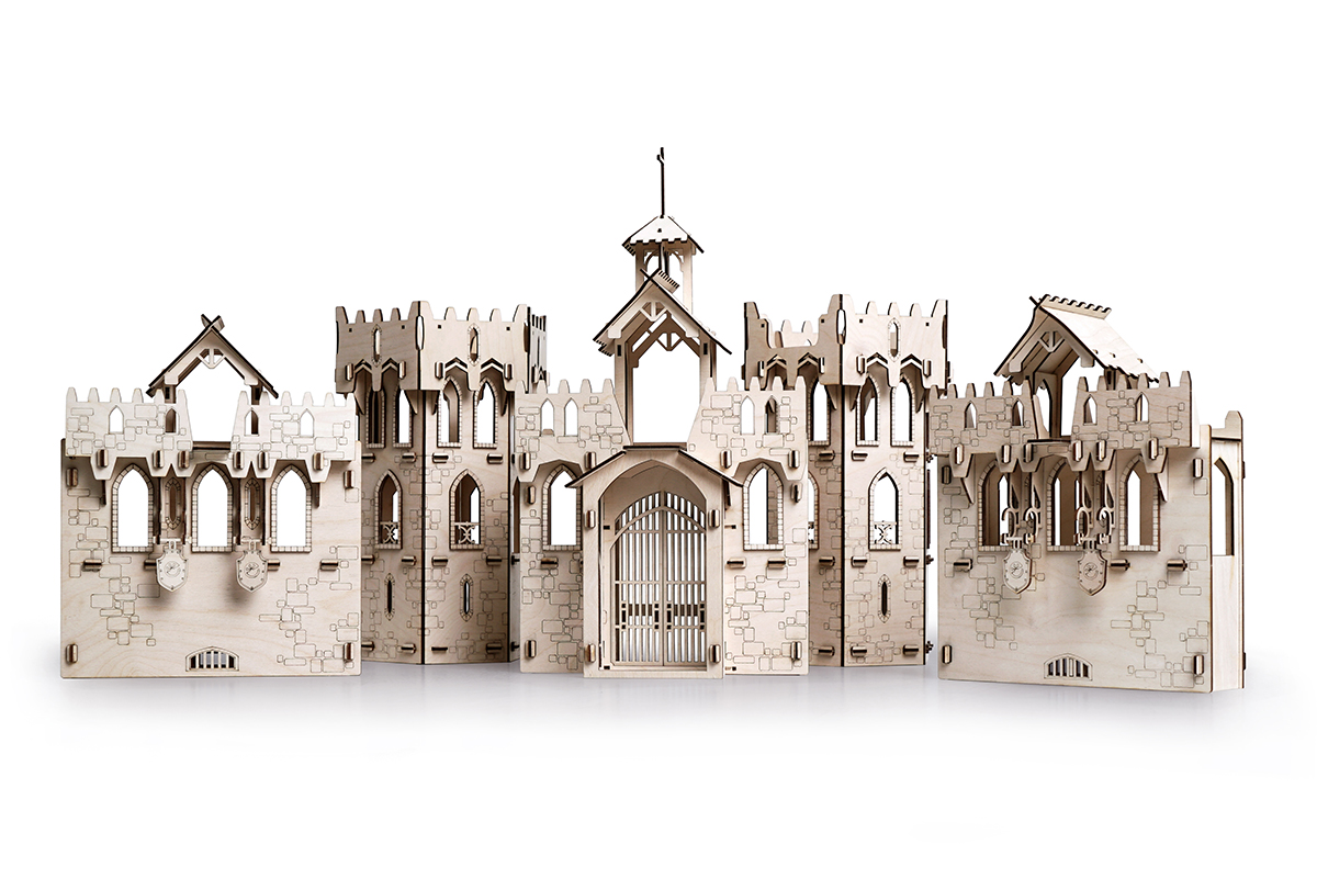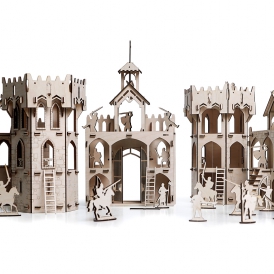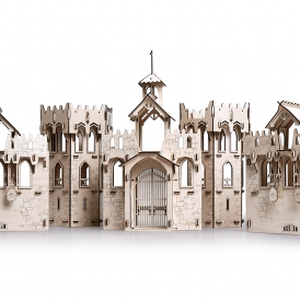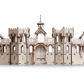 Деревянный конструктор состоит из двух башен, центральная стена, у которой есть шлавные ворота и две защитные стены со стрелковыми вышками. С одной стороны башни закрыты, с другой стороны есть лестницы, по которым можно подняться.