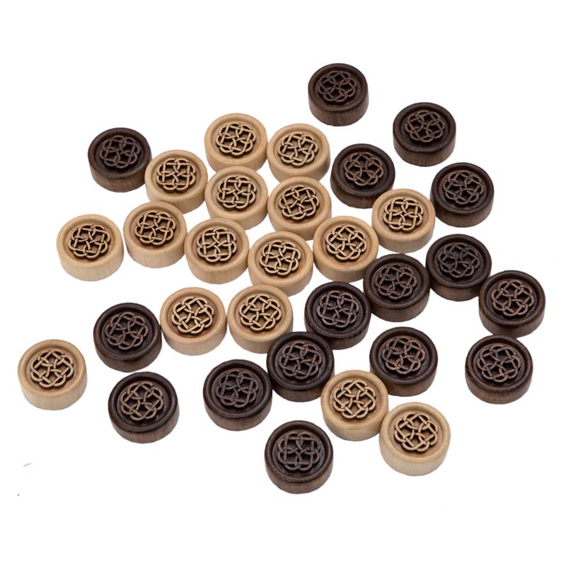 Верхняя часть украшается симметричным узором, что делает их более благородными. К нижней поверхности приклеена тканевая подкладка, обеспечивающая хорошее скольжение. Также она выполняет функцию амортизатора и не дает появиться трещинам со сколами при ожесточенных играх. Учитывая, что тут все выполняется вручную, используется качественный орех, – стоимость получается более чем оптимальной.