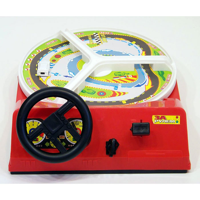 Игра «За рулем» с педалями – развивающая игра, позволяющая малышу почувствовать себя за рулем настоящего транспортного средства. Набор включает в себя: рулевое колесо, макет машины, липкую аппликацию и педали. Машина устанавливается на трассе и фиксируется при помощи магнита. Игрок управляет ею, вращая руль. Целью игры является прохождение трассы без столкновений.
