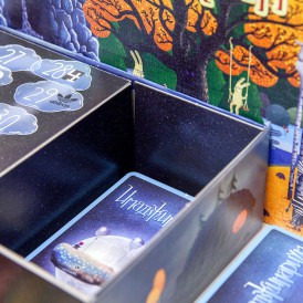 Поле для подсчёта очков (сделанное прямо на «подиуме» на коробке). 98 крупных карт с картинками. 49 карточек для голосования для 7 игроков. 7 летающих слонов для передвижения по полю (в зависимости от издания встречаются деревянные или пластиковые)