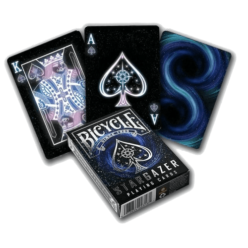 Для внешнего оформления используется космическая тематика. Цифровые изображения, а также валет, дама, король и туз, покрыты звездами и сами излучают свечение. Рубашка представляет собой двойную галактику. Цветовая палитра задней стороны достаточно темная, поэтому использовать Bicycle Stargazer для показа фокусов будет проблематично – с больших расстояний они теряются. Зато в случае с кардистри, это как раз играет на руку – перемещения, веерения и тому подобное смотрятся просто изумительно. Также этому способствует умеренная жесткость.