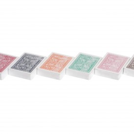 Карты несколько шероховаты, благодаря чему они не скользят в руке и между собой, но при этом – не слипаются друг с другом, поэтому легко поддаются тасовке. Пластик не боится воды, поэтому карты можно беспрепятственно мыть, даже после каждой игры. Покрытие карты не истирается со временем, поэтому они всегда выглядят как новые.
