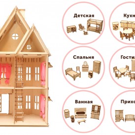 В отличии от набора, под названием 3 этажный кукольный дом-коттедж, кукольная мебель идет в полном объеме, не урезанная. Например кухня включает в себя стиральную машинку.