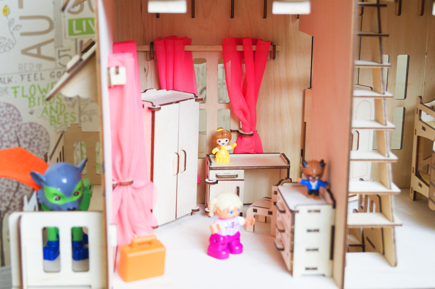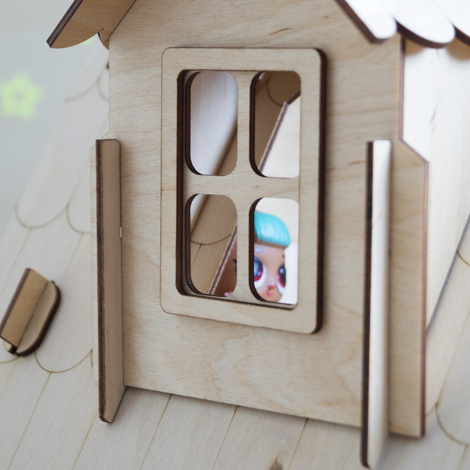 При сборке детали соединяются между собой, как конструктор в пазы. После сборки дом можно покрасить или покрыть лаком и даже поклеить обои, прекрасное "поле" для творчества.