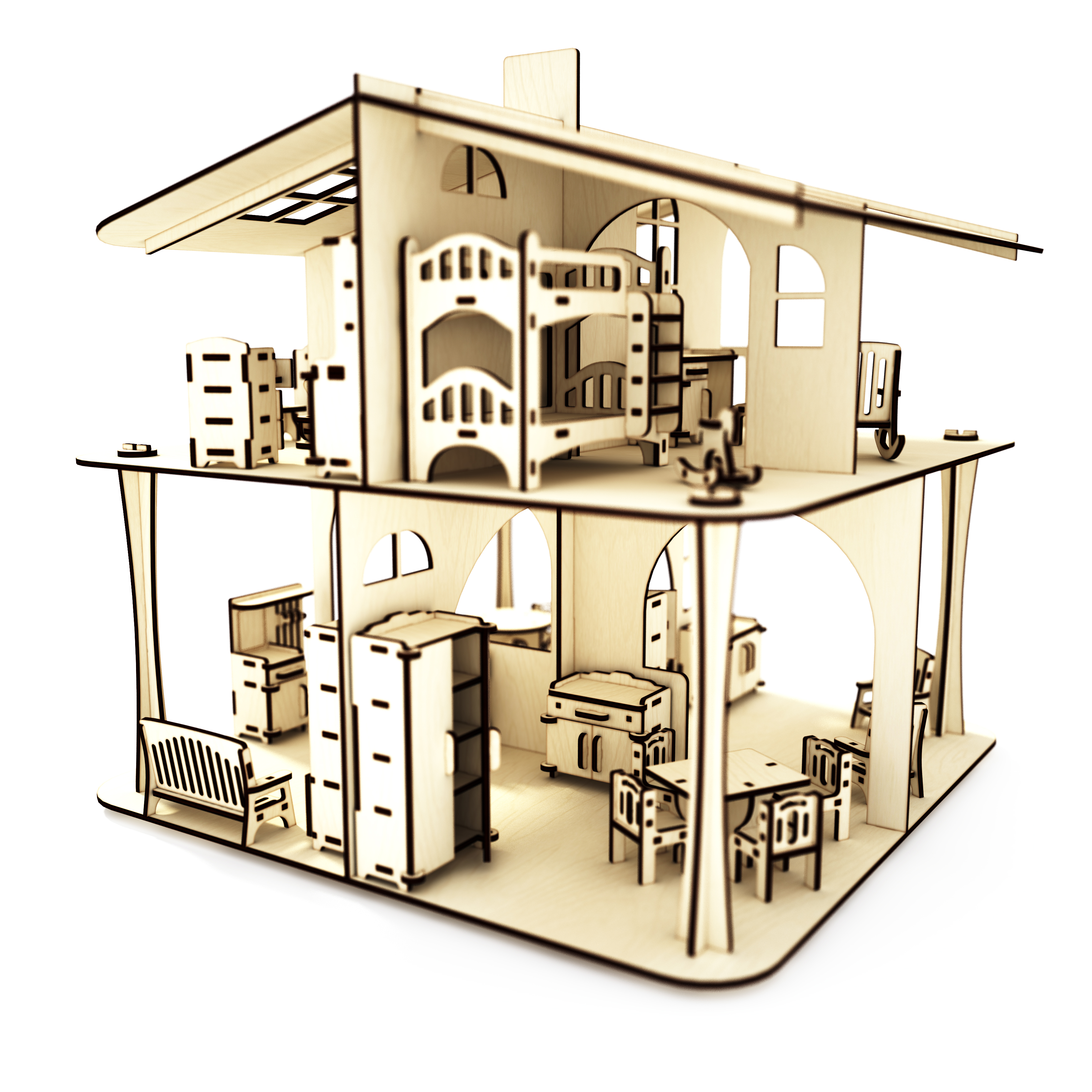 Главное отличие этого кукольного домика из фанеры, у него нет стенок. Ребенок может играть со всех сторон. Спокойно переставлять мебель и передвигать своих любимых героев. Просторный дом, свободной планировки, состоит из 2-х этажей. Отличный вариант для компании друзей.