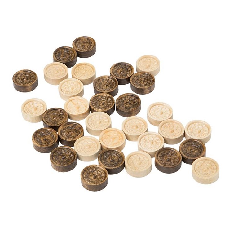 Мастер начинает свою работу с выбора материала и здесь используется прочная и долговечная орешина. Еще одна ее особенность заключается в сопротивлении механическим воздействиям, поэтому даже если участники будут случайно стучать фишками по доске, они останутся в целости и сохранности. Сама доска также не будет повреждена, т.к. снизу имеется специальная прокладка из мягкой ткани, способная амортизировать удары, и дополнительно улучшающая скольжение по доске. На верхней грани, ручным способом вырезан изысканный рисунок, придающий фишкам стильности.