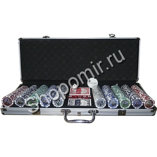 Покер 500 фишек, фишки с номиналом. Фишки изготовлены из композитного пластика, с металлическим сердечником внутри. Отличительные особенности набора - недорогой набор из сегмента наборов в кейсе, крупный номинал на стикере.