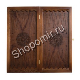 На игровом поле вырезаны декоративные элементы, повторяющие древние восточные изображения небесных тел. Доска имеет специальные лузы, позволяющие добиться идеальной компоновки фигур. Завершают композицию набора фишки из двух пород дерева светлого и тёмного оттенков с резным круговым орнаментом. Кейс из плотной ткани поможет уберечь набор от влажности и повреждений во время транспортировки.