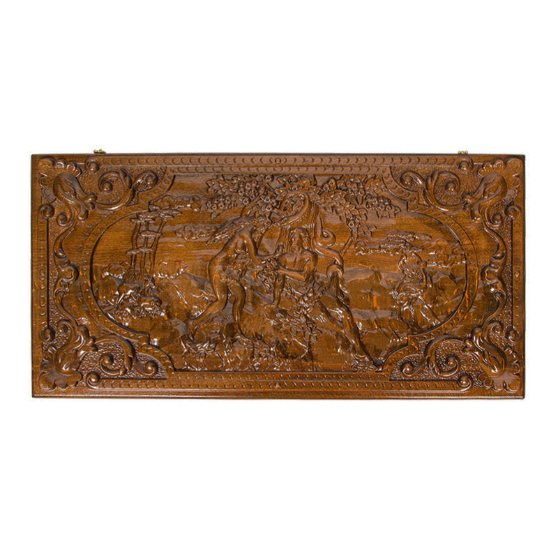 На передней створке вырезано изображение Евы, которая предлагает запретный плод Адаму. Можно сказать, что данная доска и является этим «плодом», ведь купив ее, вы не сможете оторвать глаза и на какой-то период отрешитесь от мира. На задней стороне предусмотрено шашковое поле. Все необходимое для начала партии – фишки и кости, уже лежат внутри. Вдобавок предусмотрен защитный чехол для длительного хранения и перевозки.