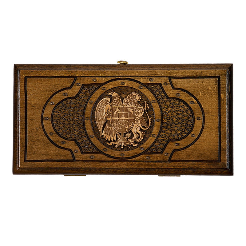 Нарды резные «Герб Армении» - удачный тандем премиального качества исполнения и оригинального дизайна. Созданные одним из лучших армянских мастеров Артуром Мирзояном, они станут запоминающимся подарком, изысканным украшением и просто хорошим способом скоротать время с другом.