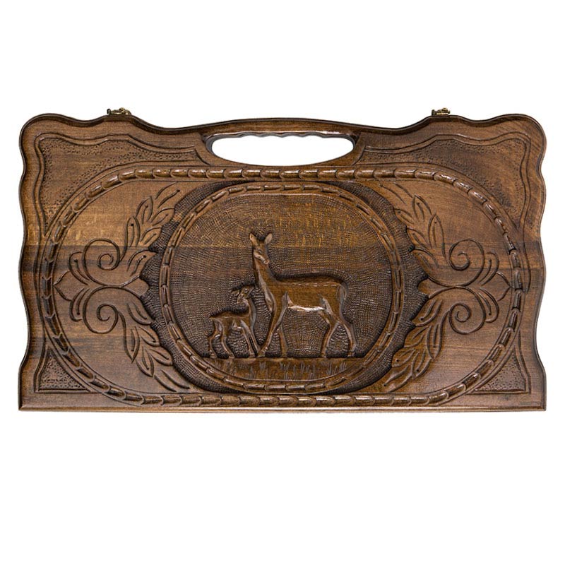 Внимание уделено и внешнему оформлению – снаружи выполнена изысканная резка, в виде оленя и маленького олененка. Они окружены простым, но таким красивым узором – лавровым венком. С обратной стороны находится поле для шашек, что очень удобно, если голова устала от продумывания ходов и комбинаций.
