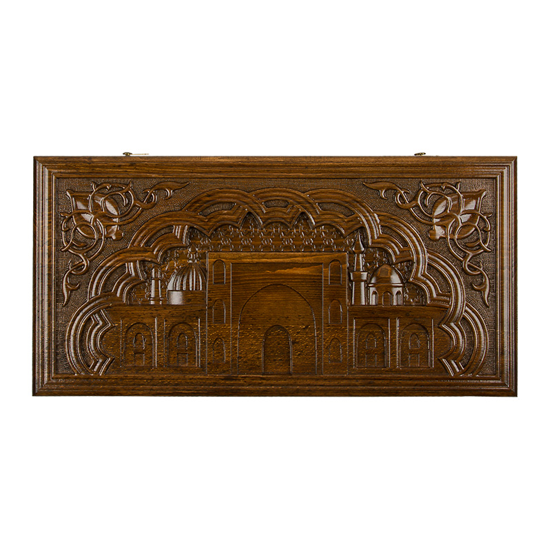 С внешних и внутренних поверхностей наносится узор, подчеркивающий высокий статус. В этом случае используется изображение Солнечных ворот – входа в главный город. Они подчеркиваются красивым узором. На противоположной поверхности находится поле для шашек, в которые можно будет развлекаться между напряженными партиями в нарды. Изнутри все также красиво – узорами подчеркнута каждая отдельная ячейка и средняя часть.