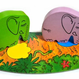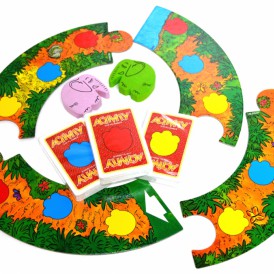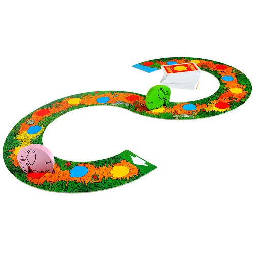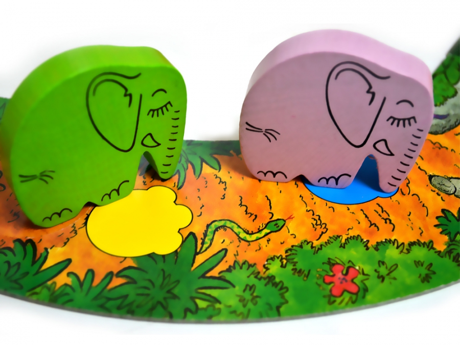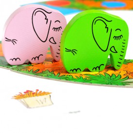 Два слоника прогуливаются по лесу. Они направляются к морю. Игроки передвигают слоников по мере того, как они дают объяснение рисунку, изображенному на карточке.