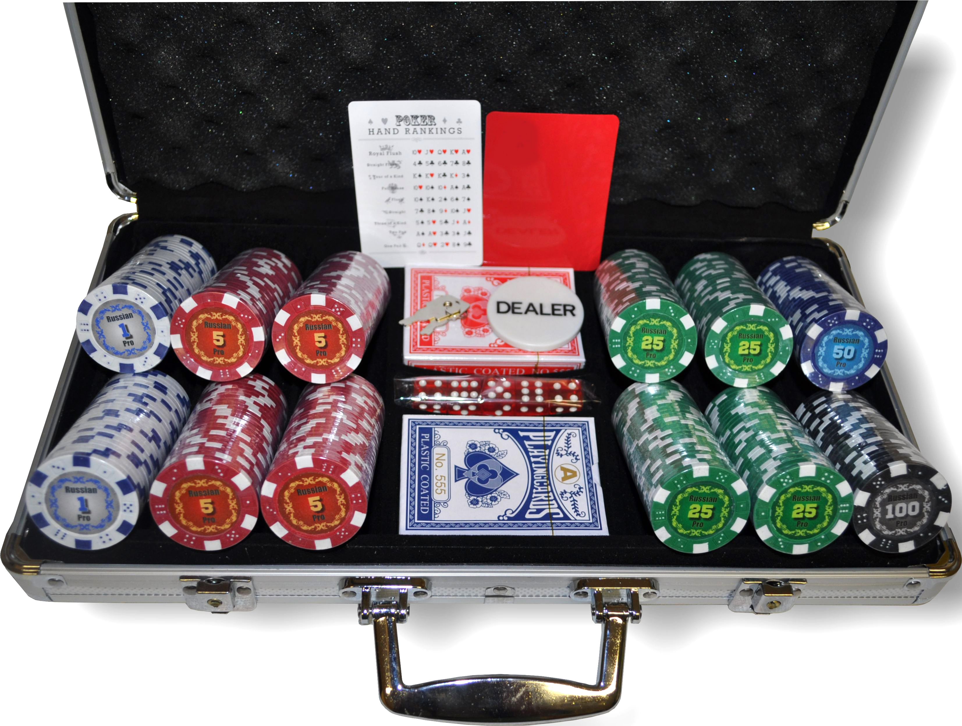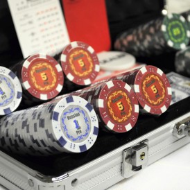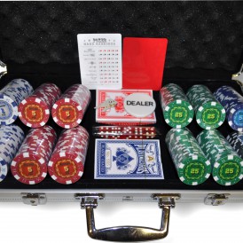 Фишки с номиналом. Фишки изготовлены из композитного пластика, с металлическим сердечником внутри. Крупный номинал на стикере. В состав входит: набор покерных фишек 300 шт (1-50шт., 5-100шт., 25-100шт., 50-25шт., 100-25шт), 2 колоды карт, 5 кубиков, 2 ключа, фишка дилера. Набор упакован в картонную коробку.