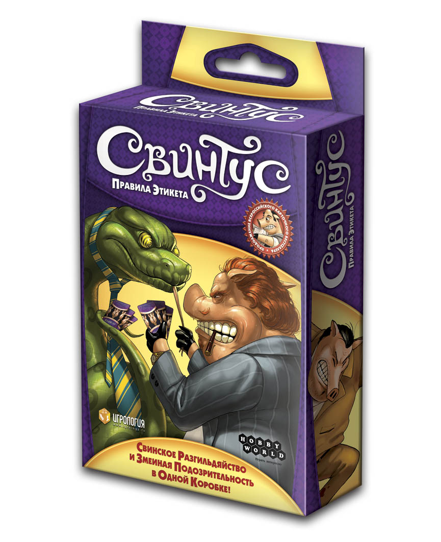 Карточная игра «Свинтус. Правила Этикета» был и остаётся старой доброй карточной игрой, так полюбившейся офисным сотрудникам, шумным компаниям и просто тем, кто любит от души посмеяться. Нужно как можно быстрее избавиться от карт на руках, сочетая их цветом или достоинством с картой, выброшенной предыдущим игроком. Но теперь в битву вступили змеи, и в процессе игры вам придётся соблюдать правила этикета. Нарушивший эти простые правила получает две штрафные карты. Так что соберитесь и будьте на чеку, но не забывайте посмеиваться над своими коллегами и получать удовольствия в процессе игры.