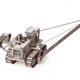 У собранной модели конструктора из дерева поднимается опускается стрела, противовес, вращаются гусеницы.